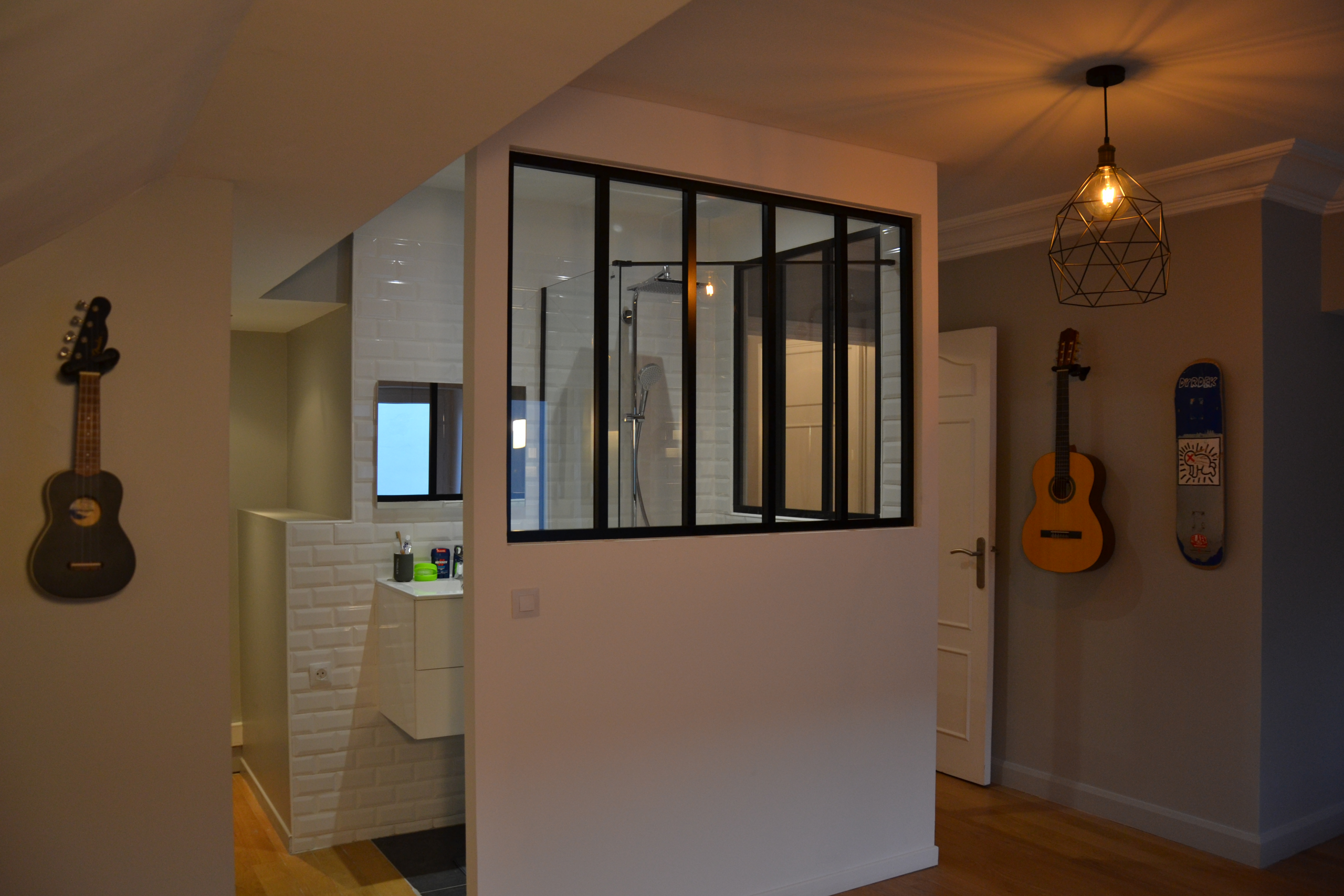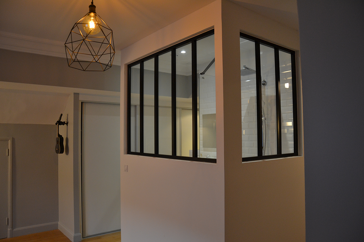 Le défi consistait à préserver la discrétion nécessaire à une salle de bain tout en profitant de la clarté de la chambre. La verrière d’angle, véritable pièce maîtresse du projet, répond à cette exigence avec élégance.